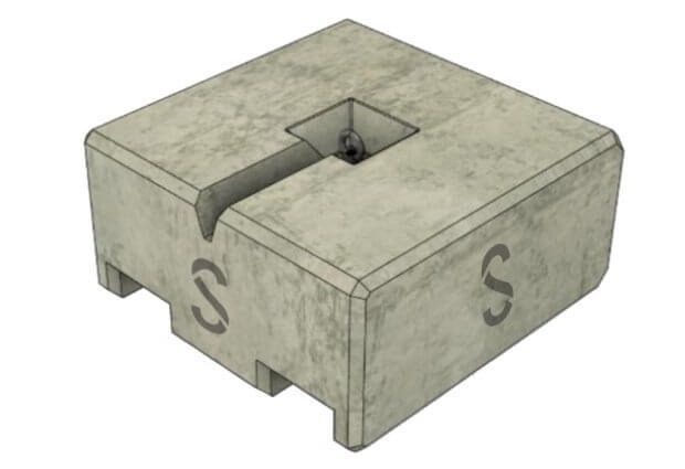 Vil du slå dit telt op et sted, hvor pløkke ikke er tilladt? Intet problem. Disse 500 kg ballastblokke er ideelle til forankring af store telte til fast grund. Ankerblokkene har to gaffelhuller (20 x 10 cm) i bunden, hvilket gør dem nemme at transportere med palleløfter eller gaffeltruck. Toppen af betonblokken har en V-formet kanal med en forsænket øjebolt til fastgørelse af rebskralde.
