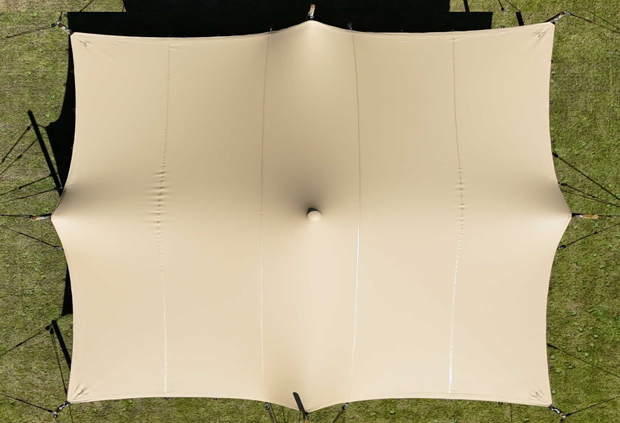 Vores stretchtelte er fremstillet med omhyggelig sans for detaljer og kvalitet. Stoffet på 720 g/m2 er coatet på den ene side og har en teknisk avanceret tekstilfinish på undersiden, udviklet eksklusivt af vores interne team. Denne kombination af materialer af høj kvalitet og brandhæmmende tekstiler garanterer en holdbar og sikker løsning, der sikrer, at dit arrangement ikke kun er behageligt, men også uden bekymringer.