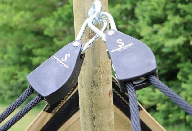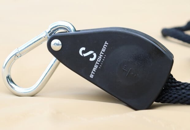 Rope Ratchet-strammeren (1/2″) inkluderer to karabinhager og 400 cm reb. Hver har en trækstyrke på 250 kg. Kort sagt, den er uforgængelig.