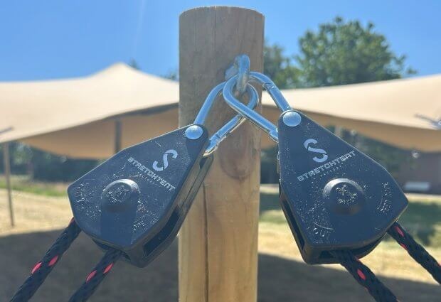 Rope Ratchet strammer rebene. Takket være dens selvlåsende mekanisme springer rebet ikke tilbage. Dette forenkler i høj grad opsætning og opspænding af teltet.